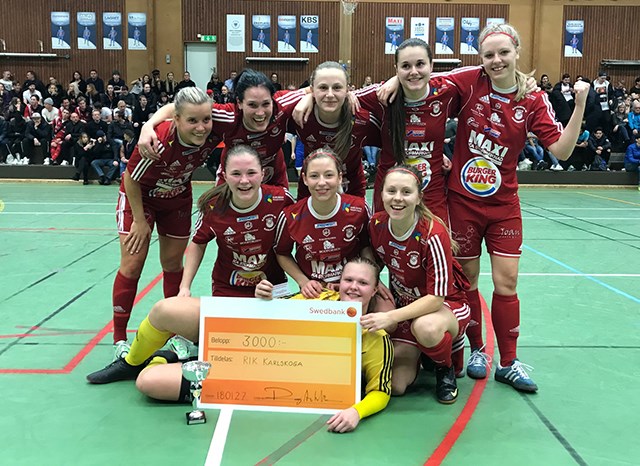 Andra cuptiteln på två dagar. Efter vinsten i Varannan Damerna på lördagen följde tjejerna upp med på söndag att för andra året i rad vinna Hallvärmländskan. Seger i finalen mot Torsby efter straffsparksläggning. Slutspelet i Kristinehamns Arena började på söndag morgon med match mot Hertzöga BK 1. Vinst med 1-0 efter mål av Jessica Axelsson. I nästa match stod Bråtens IK för motståndet. RIK Karlskoga tog hem derbyt med 3-0. Trion Ellen Hultgren, Viktoria Ström och Rebecca Stålhammar stod för målen. De två vinsterna innebar att RIK Karlskoga vann sin slutspelgrupp och i semifinal väntade Lysviks IF. Jessica Axelsson spräckte nollan. 2-0 var ett självmål. 3-0 dunkade Viktoria Ström in på straffspark. Lysvik reducerade i matchens slutskede. Men 3-1 innebar att RIK Karlskoga var klara för final. I finalen stod Torsby IF på andra planhalvan. Även i denna match tog RIK Karlskoga ledningen. Denna gång genom Rebecca Stålhammar. Hon hade också ett gyllene läge att öka på ledningen, men bollen tog stolpe, stolpe och ut. Istället kvitterade Torsby i slutminuterna. 1-1 var också resultatet efter 25 minuter. Straffsparksläggning skulle avgöra finalen. Torsby började. Och Alexandra Blom gjorde en kvalificerad räddning. Rebecca Stålhammar var sedan så nära att sätt bollen i nät. Torsby missade sin nästa straff. Rebecca Hane tryckte dock in 2-1. I omgång 3 räddade åter Alexandra Blom Torsbys straff. Rebecka Kristensen ökad på till 3-1. I omgång 4 missade Torsby sin straff och därmed stod det klart att RIK Karlskoga vann finalen. Lagkapten Hanna Sahlén fick sedan höja segerpokalen som bevis på att RIK Karlskoga vann Hallvärmländskan 2017/2018.