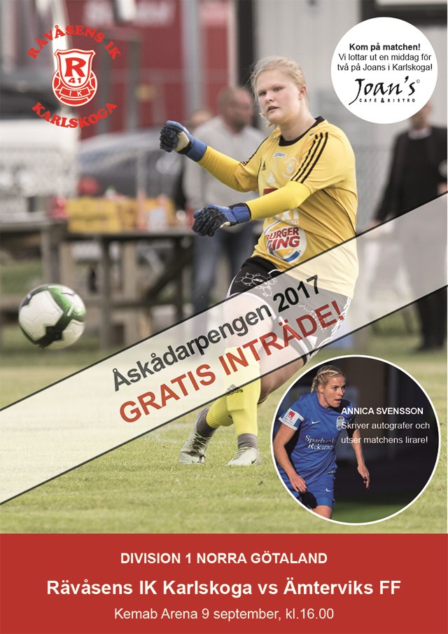 Fyra omgångar återstår innan årets seriespel ska summeras. Och RIK Karlskoga återfinns på placering tre i tabellen. Denna helg är det hemmamatch mot Ämterviks FF. Ännu en av många tuffa derbymatcher i Division I Norra Götaland. Matchen är lika med Åskådarpengen, vilket betyder att det är fri entré då sponsorer ger bidrag per åskådare. När lagen möttes i juni månad vann RIK Karlskoga med uddamålet. Men det var en tuff drabbning och det kan det säkert bli även denna gång. Ämtervik är ett rutinerat lag och har en stark defensiv med en duktig målvakt. Tålamod och fokus En nyckel på lördag blir just att dyrka upp Fryksdalslagets försvar. Då behöver man ha tålamod och vara fokuserad. - De har ett starkt och välorganiserat lag. För oss gäller att ha tålamod i vårt offensiva spel. Och när vi får lägen att ta vara på dem. Dessutom måste vi minimera våra misstag. För vi vet att Ämtervik är framför allt väldigt duktiga på omställningar. Därför måste vi ha fokus i allt vi gör. Från avspark till slutsignalen ljuder, säger tränare Ronny Spjuth. Den senaste tidens kraftiga nederbörd har gjort att Kilsta IP inte är speldugligt skick. Därför kommer matchen att spelas på konstgräset på Kemab Arena. Hoppas på storpublik Matchen är lika med Åskådarpengen 2017. Det innebär att det är gratis entré genom att företag och privatpersoner lämnar bidrag per åskådare. Om vädergudarna är på gott humör kan det förhoppningsvis bli tätt på läktarplats på Kemab Arena. - VI hoppas såklart på storpublik. Det vore otroligt roligt om det kom mycket folk och vi kunde prestera en bra fotboll, säger Ronny Spjuth. Jade Flory är bortrest. Däremot är duon Alva Jansson och Jessica Karlsson åter med i truppen. Truppen ser ut enligt följande: Magdalena Blom, Madeleine Melander, Nathalie Hallquist, McKenna Meuer, Emma Röös, Jenny Tropp, Sofie Petri, Rebecca Stålhammar, Viktoria Ström, Rebecka Kristensen, Sara Lilja-Vidlund, Hanna Sahlén, Jessica Karlsson, Amandha Sjöberg, Alva Jansson och Alexandra Blom. Avspark 16.00, Rävåsens IK Karlskoga-Ämterviks FF, Kemab Arena Läs vad Ämtervik skriver inför matchen